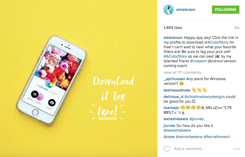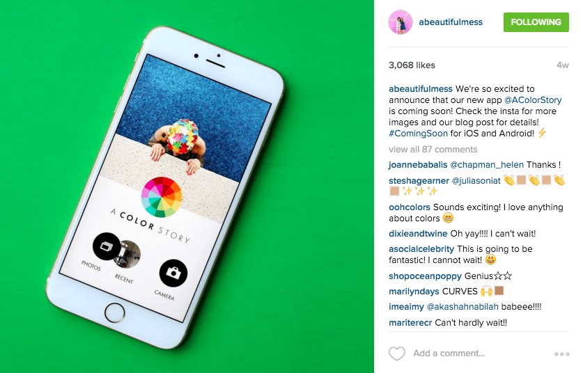 A Color Story was first announced in a blog post on A Beautiful Mess, and readers were encouraged to follow the app's Instagram channel to stay informed of the launch date. They posted regularly to the channel to keep it top of mind for their followers, and started engaging their community before the app was even available.